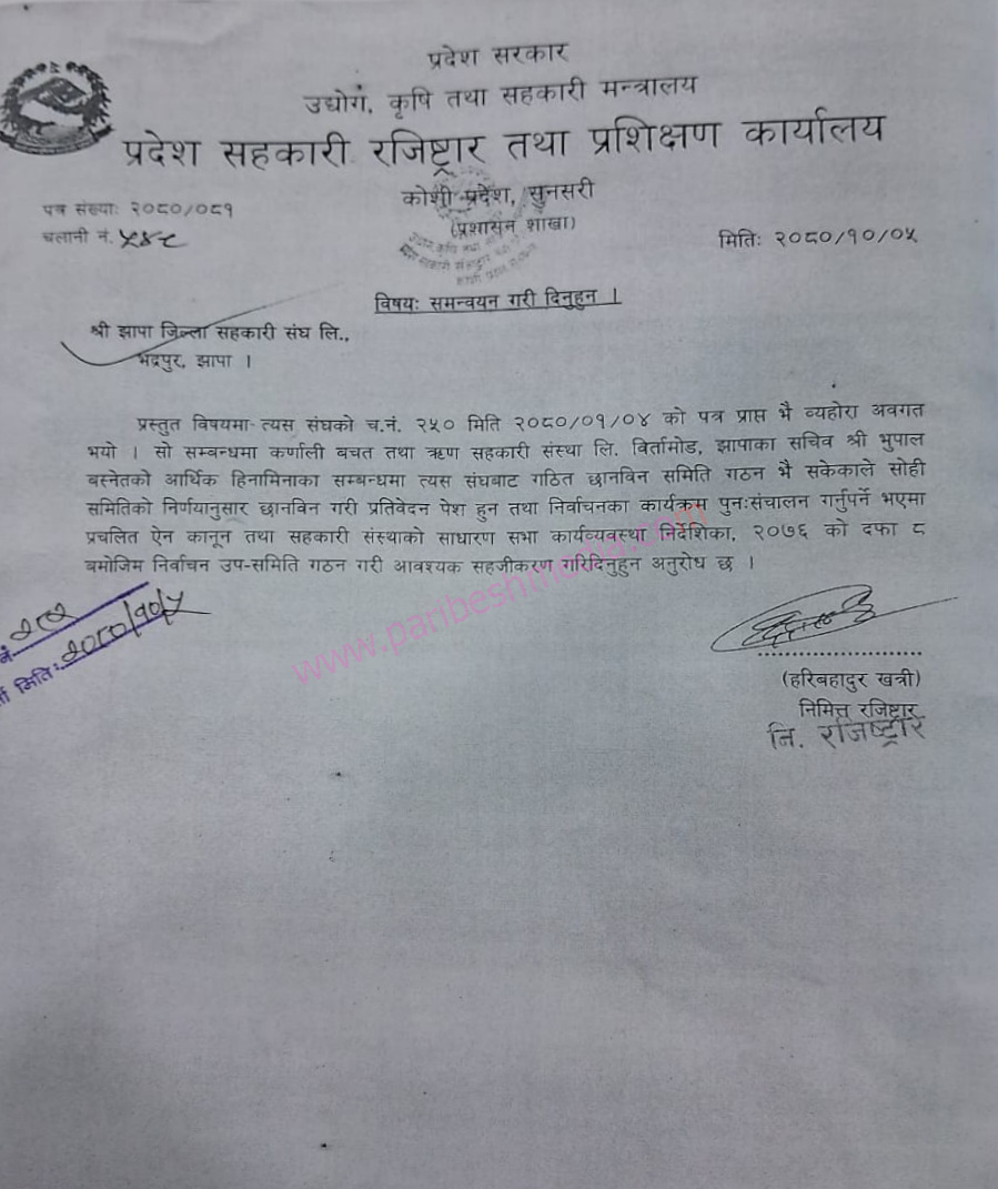 यता माघ १० गते प्रदेश रजिष्ट्रारको कार्यालयले झापा जिल्ला सहकारी संघलाई कर्णाली साकोसका सचिव भुपाल बस्नेतको आर्थिक हिनामिनाका सम्बन्धमा संघले गठन गरेको समितिले प्रतिवेदन पेश गर्न र निर्वाचन कार्यक्रम पुनः सञ्चालन गर्नुपर्ने भएमा प्रचलित ऐन कानुन तथा सहकारी संस्थाको साधारण सभा कार्यव्यवस्था निर्देशिका, २०७६ को दफा ८ बमोजिम निर्वाचन उपसमिति गठन गरी आवश्यक सहजीकरण गरिदिनहुन भन्दै पत्र पठाएको थियो ।