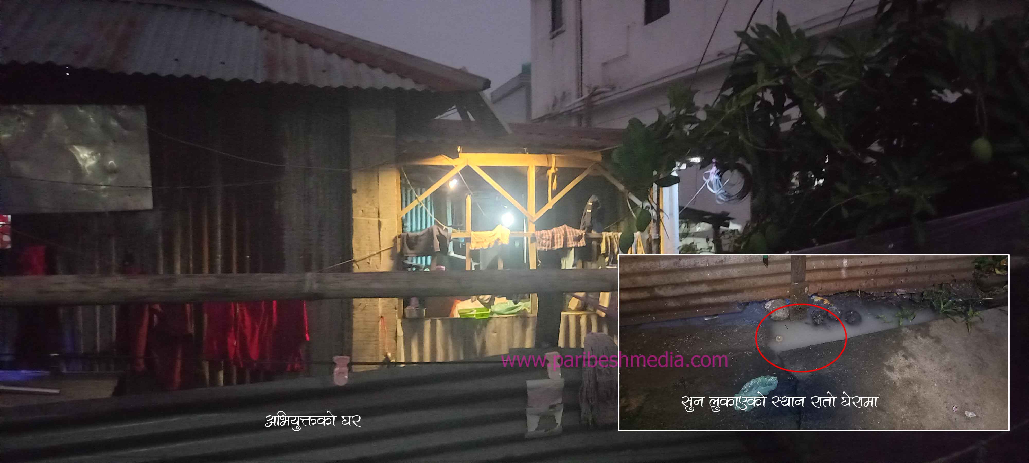 प्रहरीले गाडेको अवस्थामा सुनको सिक्का भएको बेरुवा औठी १ थान, सुनको हातमा लगाउने बाला १ थान, सुनको जन्तर १ थान, सुनको सिक्री १ थान, सुनको टप १ थान र चाँदीको कलश १ थान बरामद गरेको थियो । साथै घटनामा प्रयोग भएको मार्तोल र रेञ्जसमेत बरामद गरेको प्रहरीले जनाएको छ ।