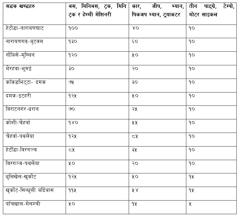२०७६ वैशाख २ गते राजपत्रमा प्रकाशित गर्दै १४ वटा सडकको उपभोग दस्तुर कायम गरियो । हेटौडा–नारायणघाट, नारायणघाट–बुटवल, नौबिसे–मुग्लिन, भैरहवा भूमई, काकडभिट्टा–दमक, दमक–इटहरी, विराटनगर–धरान, कोशी–चैहर्वा, चैहर्वा–पथलैया, हेटौँडा–वीरगञ्ज, वीरगञ्ज–पथलैया, धुलिखेल–खुर्कोट, खुर्कोट–सिन्धुली–बर्दिबास, पाँचखाल–मेलम्ची र नारायणगढ–मुग्लिन रहेका थिए ।