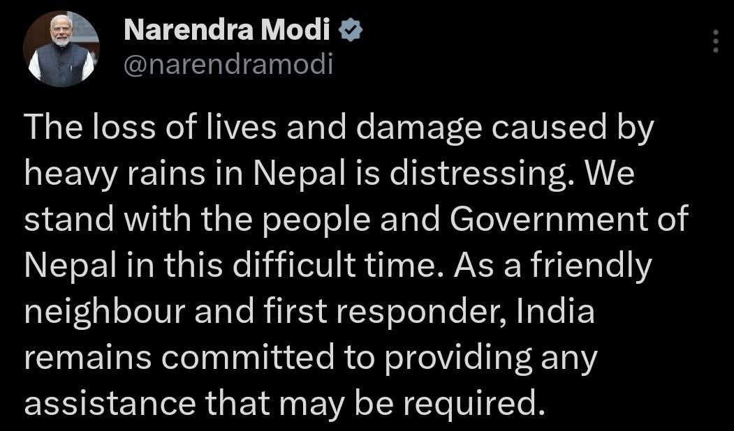 बिर्तामोड । भारतीय प्रधानमन्त्री नरेन्द्र मोदीले नेपालमा भारी वर्षाका कारण भएको जनधनको क्षति पीडादायी भएको बताएका छन् ।