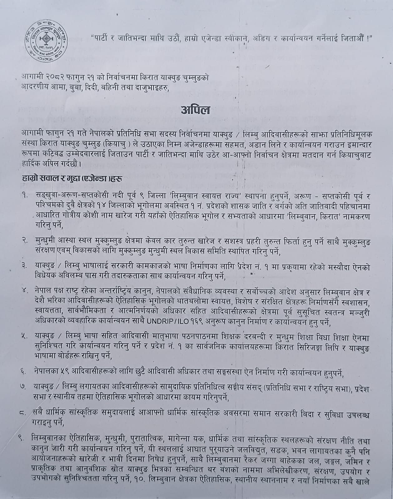 उनीहरुले आफ्नो संस्कृति र सभ्यतासँग जोडिएको मुक्कुम्लुङ संरक्षणका लागि केबलकार बन्न नहुने र कोशी प्रदेश नामाकरण खारेजी हुनु पर्ने मागसहित प्रतिबद्धताका लागि दलहरुलाई अपिल गरेका छन् । उनीहरुले विभिन्न १४ वटा माग र सवाल अघि सार्दै ‘पार्टी र जातिभन्दा माथि उठौँ, हाम्रो एजेण्डा स्वीकार्ने, अडिग र कार्यान्वयन गर्नेलाई जिताऔँ’ भन्ने अपिल गरेका छन् ।