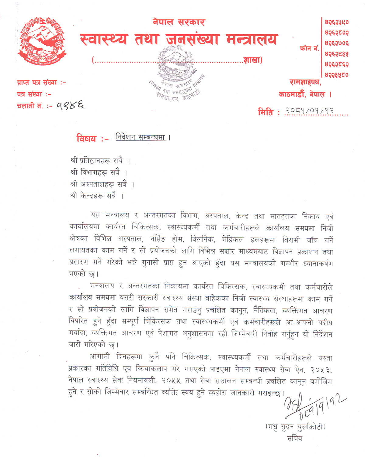 ‘मन्त्रालय र अन्तरगतका निकायमा कार्यरत चिकित्सक, स्वास्थ्यकर्मी तथा कर्मचारीले कार्यालय समयमा यसरी सरकारी स्वास्थ्य संस्था बाहेकका निजी स्वास्थ्य संस्थाहरूमा काम गर्ने र सो प्रयोजनको लागि विज्ञापन समेत गराउनु प्रचलित कानून, नैतिकता, व्यक्तिगत आचरण विपरित हुने हुँदा सम्पूर्ण चिकित्सक तथा स्वास्थ्यकर्मी एवं कर्मचारीहरूले आ–आफ्नो पदीय मर्यादा, व्यक्तिगत आचरण एवं पेशागत अनुशासनमा रही जिम्मेवारी निर्वाह गर्नुहुन यो निर्देशन जारी गरिएको छ,’ मन्त्रालयको पत्रमा भनिएको छ ।