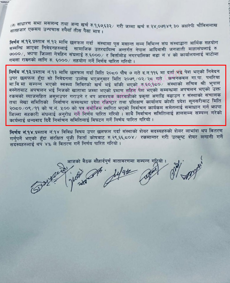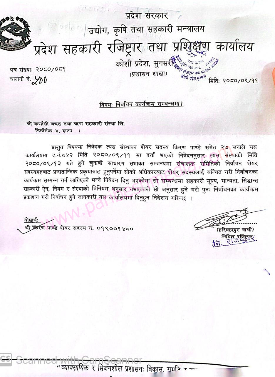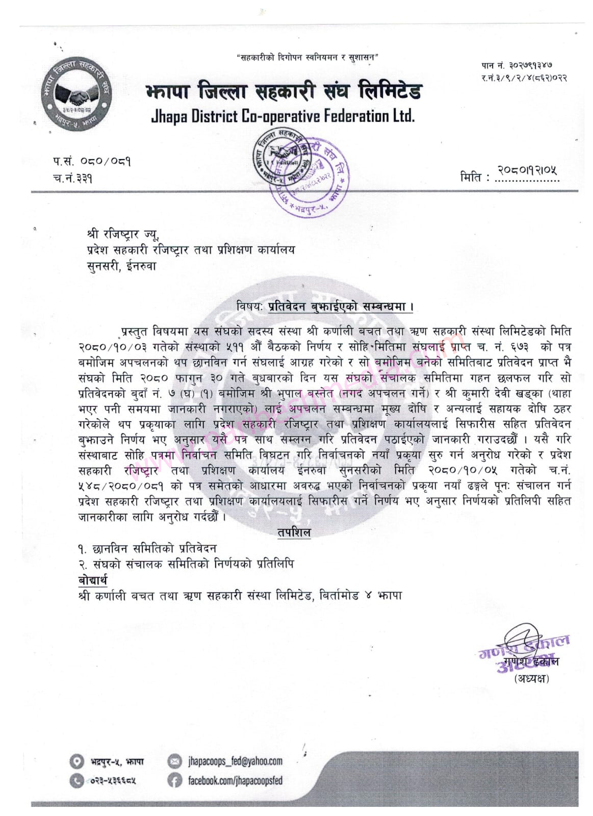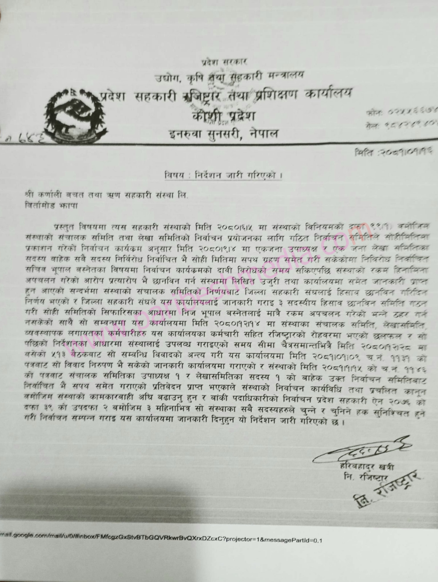 यता माघ १० गते प्रदेश रजिष्ट्रारको कार्यालयले झापा जिल्ला सहकारी संघलाई कर्णाली साकोसका सचिव भुपाल बस्नेतको आर्थिक हिनामिनाका सम्बन्धमा संघले गठन गरेको समितिले प्रतिवेदन पेश गर्न र निर्वाचन कार्यक्रम पुनः सञ्चालन गर्नुपर्ने भएमा प्रचलित ऐन कानुन तथा सहकारी संस्थाको साधारण सभा कार्यव्यवस्था निर्देशिका, २०७६ को दफा ८ बमोजिम निर्वाचन उपसमिति गठन गरी आवश्यक सहजीकरण गरिदिनहुन भन्दै पत्र पठाएको थियो ।