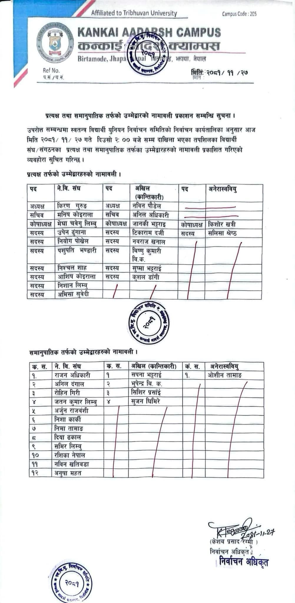 त्यस्तै नेविसंघको तर्फबाट प्रत्यक्षतर्फ अध्यक्षमा किरण गुरुङ, सचिवमा मनिष कोइराला, कोषाध्यक्षमा मेघा जबेगु लिम्बु, सदस्यहरु उपेन ढुंगाना, नियोग पोख्रेल, पशुपति भण्डारी, निश्चल शाह, आशिष कोइराला, निशान लिम्बु र अमिसा सुवेदीले मनोनयन दर्ता गराएका छन् । यता समानुपातिक तर्फ १२ जनाले मनोनयन दर्ता गराएका छन् । समानुपातिक तर्फ अधिकतम् ९ जनाको नाम दर्ता गराउनुपर्नेमा नेविसंघले १२ जनाको नाम दर्ता गराएको एक विद्यार्थी नेताले बताए ।