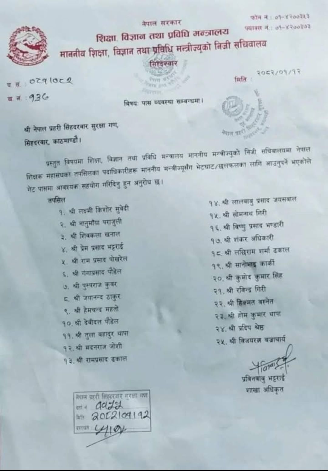 त्यसका लागि शिक्षा मन्त्रालयले २५ जनाको सूची गेट पासका लागि सिंहदरबारको गेटमा पठाएको थियो । सुरक्षाकर्मीले सोही अनुसार मन्त्रीलाई भेट्न आउने शिक्षक नेताहरूको गेट पास लिएर बसेको थियो ।