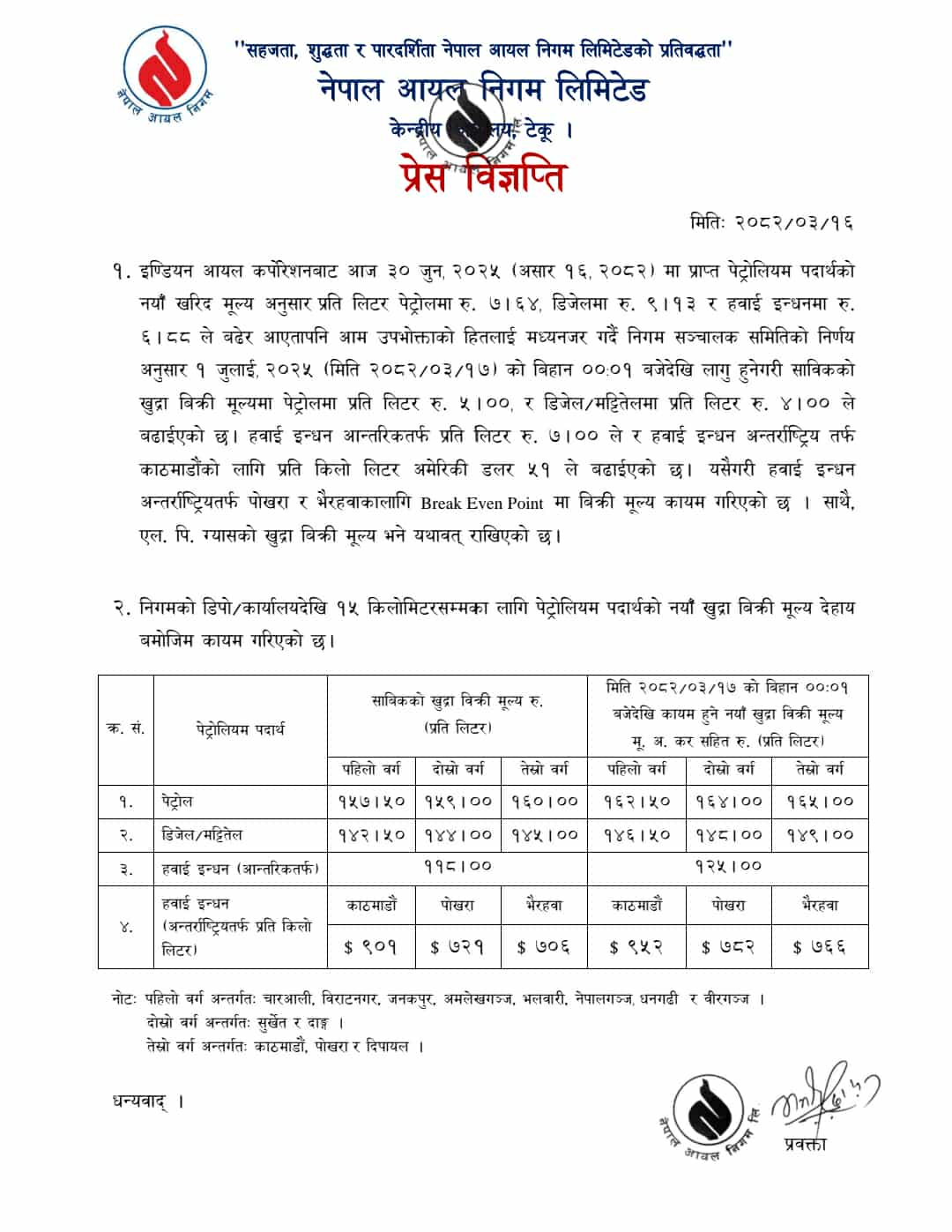 पेट्रोलियम पदार्थको मूल्य वृद्धि, आजबाट लागू हुने