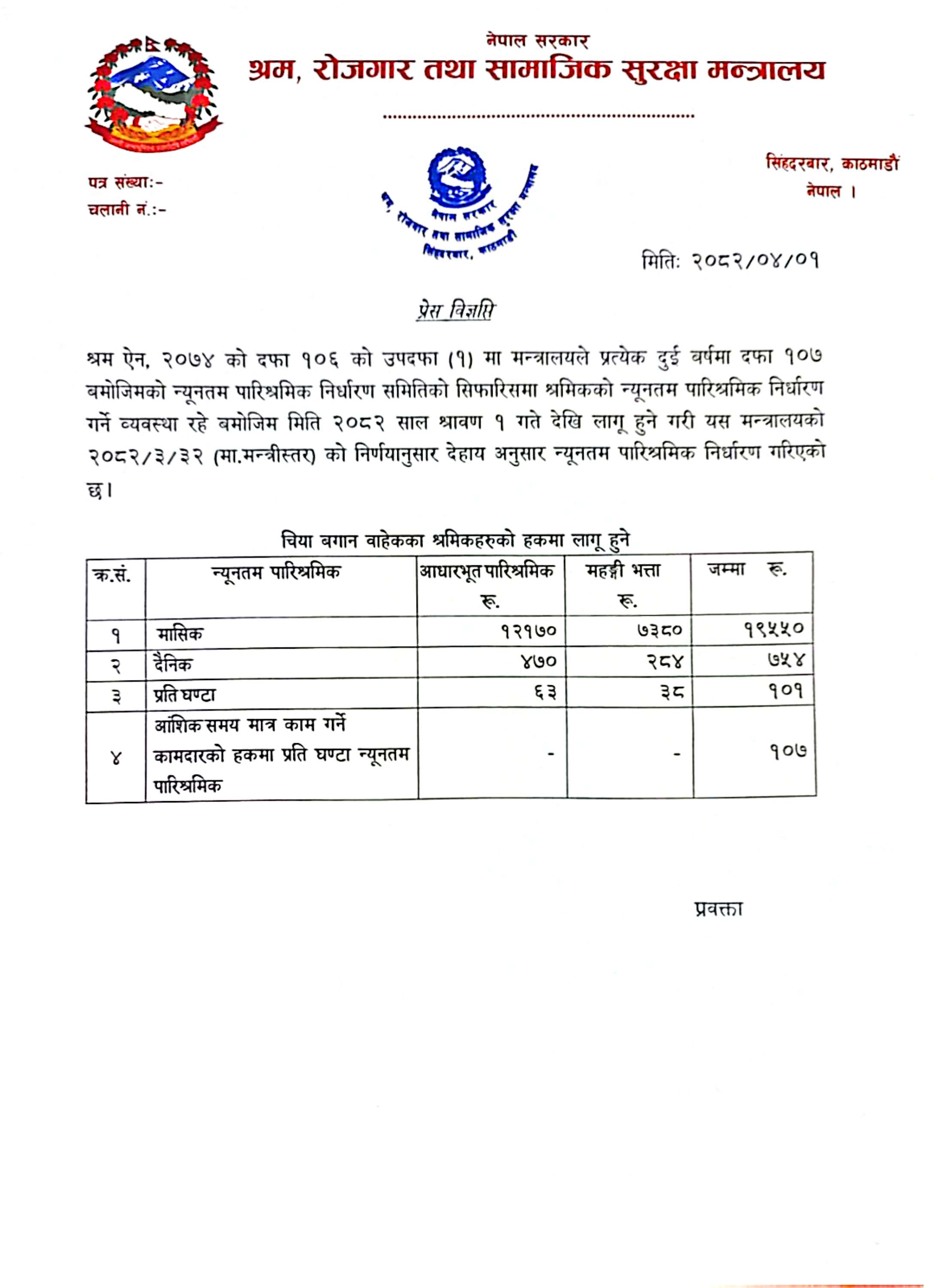 श्रम ऐन, २०७४ को दफा १०७ अनुसार प्रत्येक दुई वर्षमा श्रमिकको न्युन्तम पारिश्रमिक पुनः निर्धारण गर्नुपर्ने व्यवस्था छ । यसअघि श्रमिकको न्ययूनतम पारिश्रमिक १७ हजार ३०० थियो । न्यूनतम ज्यालाको निर्धारण त्रिपक्षीय सहमतिका आधारमा निर्णय गरिएको यो पहिलो पटक हो ।