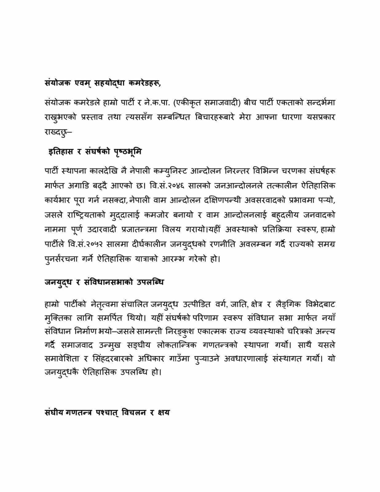 पेरिसडाँडामा बसेको सचिवालय बैठकमा लिखित रूपमा आफ्नो धारणा राख्दै एकता प्रक्रिया छाडेर पार्टी पुनर्गठनमा गर्नुपर्ने बताए ।