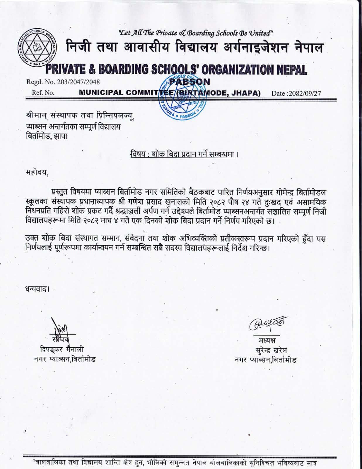 प्याब्सन झापाले गोमेन्द्र विर्ता मोडेल स्कुलका संस्थापक प्रधानाध्यापक स्वर्गीय गणेशप्रसाद खनालप्रति सम्मान र समवेदना प्रकट गर्दै विद्यालयमा शोक विदा दिने निर्णय गरेको अध्यक्ष सुरेन्द्र खरेलले जानकारी दिए ।