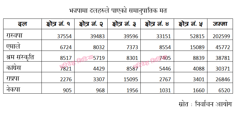झापामा क्लिन स्वीप गरेको राष्ट्रिय स्वतन्त्र पार्टीले समानुपातिक तर्फपनि सबैभन्दा धेरै २०२५९९ मत पाएको छ ।